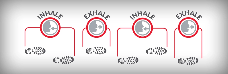 Second, when we inhale, we contract and stabilize our diaphragm and core muscles making them more stable during the inhalation phase of breathing.  When your foot hits the ground, the force of impact equals two to three times your body weight. That stress of impact is greatest when your foot strikes the ground. If that impact is at the beginning of an exhalation, it catches us at the most unstable times for the pelvis and core. Rhythmic breathing can train us to time the impact force more with our inhalation (more stability in our diaphragm and core muscles) and to shift the impact from the right foot to the left. And instead of repeatedly inhaling and exhaling on the same foot, a 5-step running pattern can help spread that impact between the feet and reduce the stress on the body. This technique may allow you to maximize your performance and reduce injuries and even side stitches.
